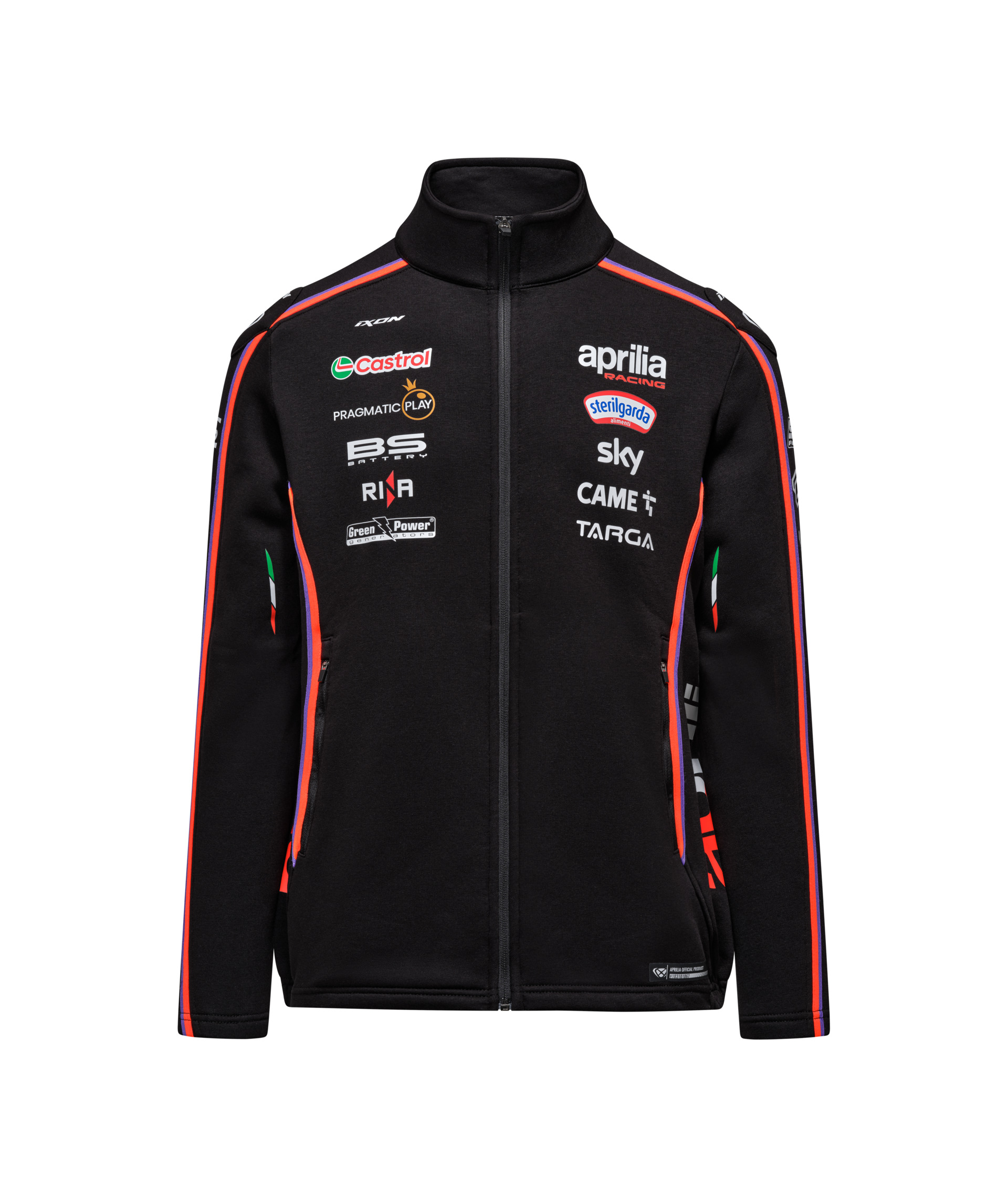 Show your support for Aprilia Racing with the Aprilia Racing MotoGP Replica Sweatshirt for men. This black and neon red sweatshirt is an exact replica of the design worn by the Aprilia Racing Team in MotoGP 2025. This sweatshirt offers a comfortable fit with a technical material inspired by racing apparel. The graphics on the sweatshirt are inspired by the 2025 livery of the Aprilia Racing motorcycles, adding a unique touch to your racing attire. the back of the sweatshirt proudly displays the Italian flag, a symbol of the rich heritage and spirit of competition that Aprilia Racing embodies. Material: Polyester and cotton.